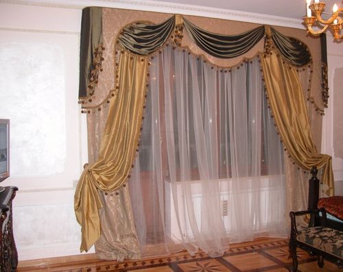 Обязательно должна присутствовать отделка более контрастная по сравнению с портьерами, таким образом, декоративный элемент выделяется из общего фона.