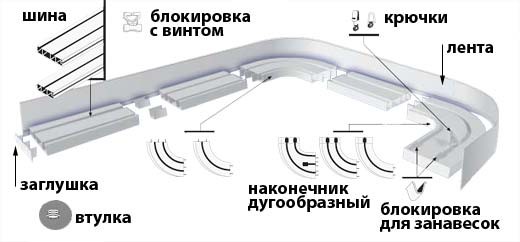 Перед тем как вы приступите к проведению работ, вам нужно приобрести карниз, он может продаваться как комплектом, так отдельными элементами, поэтому в первую очередь надо разобраться, из каких частей он состоит: