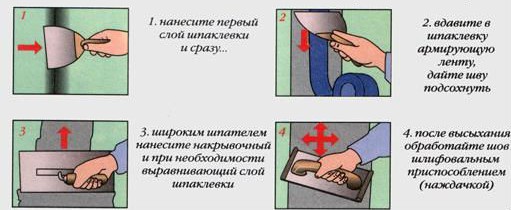 Лента достаточно легко наклеивается на шов, поскольку имеет клейкую основу. После этого место стыка нужно будет зашпаклевать финишной шпаклевкой. В результате не должно остаться никакого углубления. Лишнюю шпаклевку нужно убрать с помощью широкого шпателя. После того, как шпаклевка высохнет место стыка еще раз должно быть зачищено наждачной бумагой.