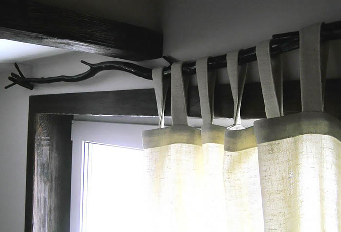 Необычная идея для карнизов: длинные сухие ветви. Легкие светлые ткани на них крепятся с помощью крючков, а непрозрачные декоративные занавеси можно просто перебросить через них