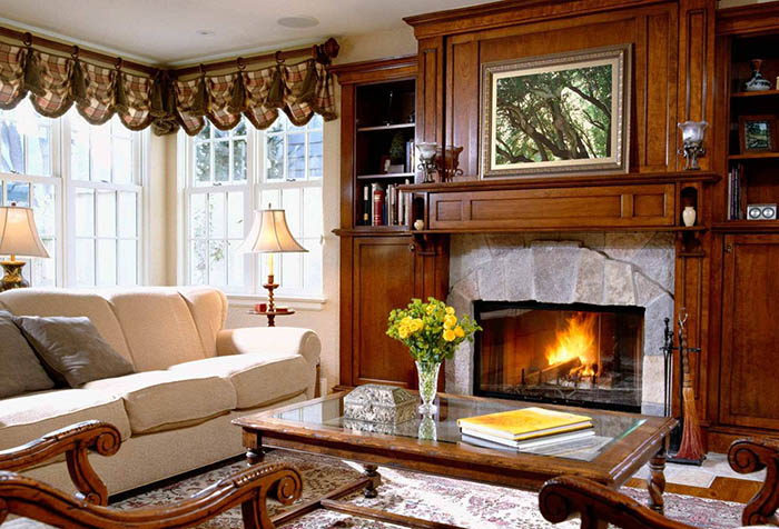 Американский стиль характеризует любовь к симметрии в композиции интерьера. Занавеси на окнах здесь крепятся с помощью одинаковых коротких карнизов