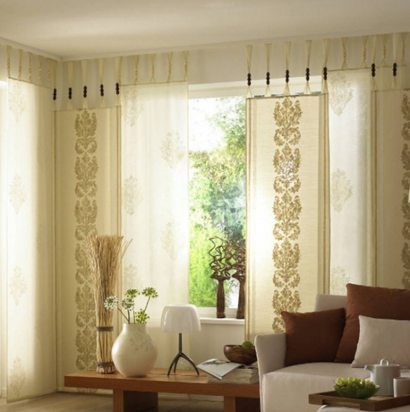 Дизайнеры часто сочетают раздвижные шторы для больших окон и римские для узких. Эффектны будут в гостиной раздвижные портьеры на одной стороне и наличие ламбрекена с другой, особенно если они гармонируют с мягкой мебелью.