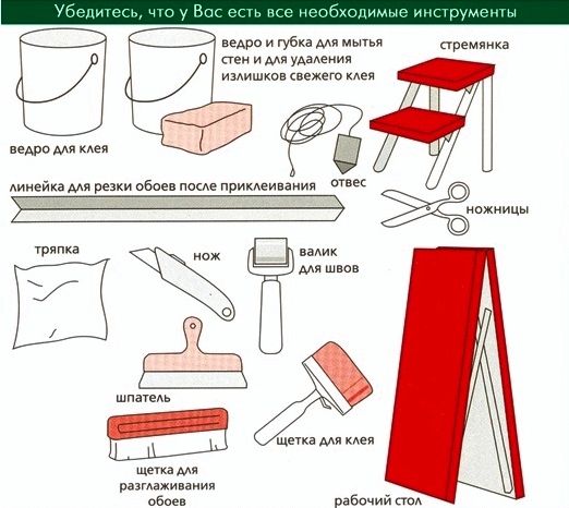 Первым делом, необходимо собрать все подобранные инструменты и приспособления, необходимые для подготовки и поклейки: ножницы либо нож, емкость для клея, кисточки (большую и малую), отвес, карандаш, монтажный стол, линейку, сухую чистую ткань и пластмассовый гребень для выравнивания наклеенных полотен.