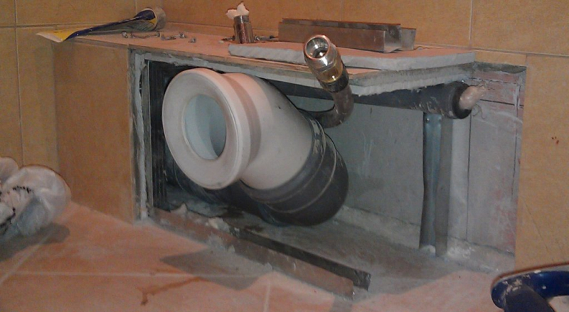 Прибегают к нему, если трубы водостока и канализации располагаются позади унитаза на всю стену. Предлагаемая конструкция проста в реализации, схема ее выполнения выглядит примерно так:
