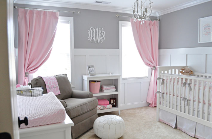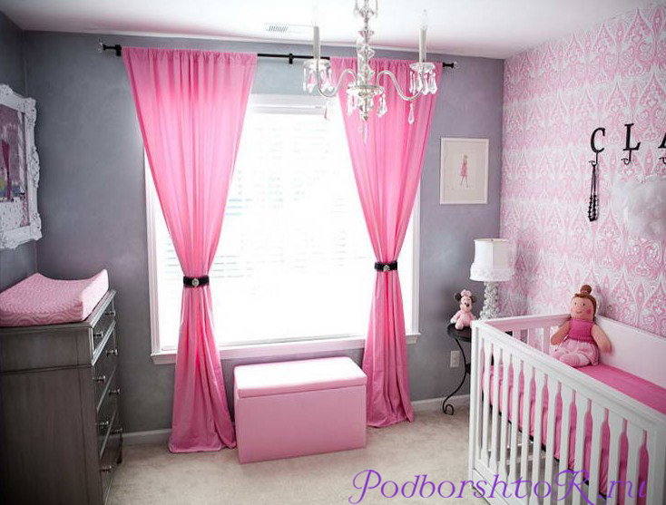 Серый и розовый цвета идеально сочетаются друг с другом. Холодный оттенок дарит ощущение свежести, уравновешивает яркость стен и делает интерьер менее легкомысленным. Такая комбинация смотрится стильно и современно. При этом шторы могут быть просто серыми или иметь серебристый блеск.