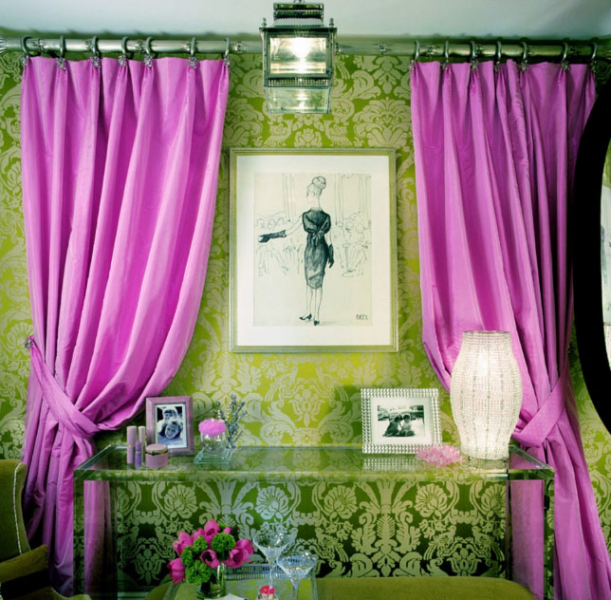 - Шторы цвета фуксии в интерьере успокаивают и настраивают на сон;
