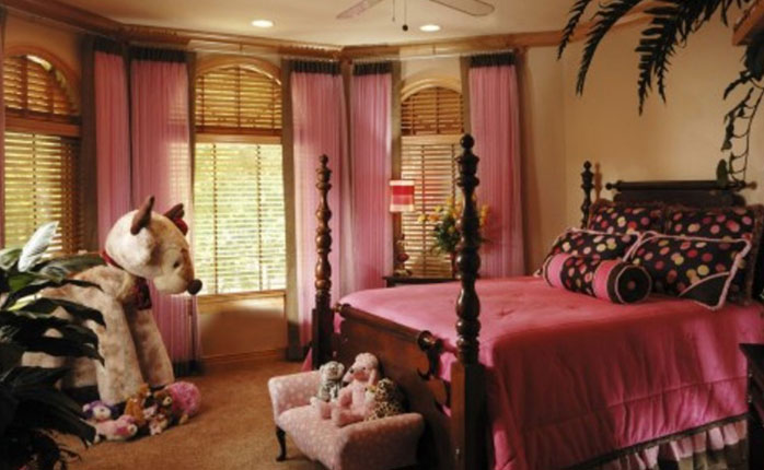 Такая комната, как спальня, тоже подходит для использования «женственного» оттенка. Розовые стены в спальне смотрятся гармонично, если остальные предметы обстановки не отличаются яркими красками. Используя сочетания с природными оттенками, можно создать максимально приближенный к природе романтический интерьер. Розовые шторы в спальню смотрятся нежно и ненавязчиво при выборе не слишком ярких, но сочных оттенков.
