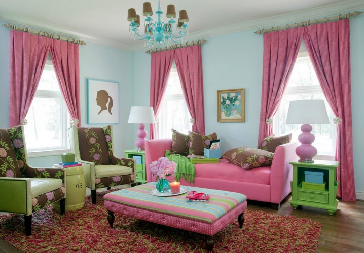 Еще один неожиданный дуэт – розовый и сине-голубая гамма. Небесно-голубые шторы будут очаровательно смотреться в детской комнате. В других же помещениях такое сочетание будет выглядеть неуместно.