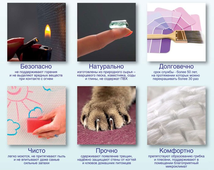 | Антивандальные качества | Стеклотканевые обои сложно снимаются, так как пропитка крепко соединена с клеем. |