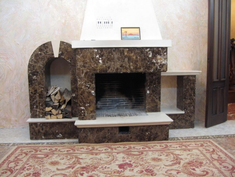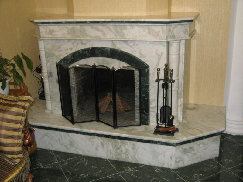Мраморные камины могут иметь разнообразные варианты облицовочного камня. Достоинством материала является его прочность и устойчивость к воздействию высоких температур, поэтому он идеально подходит для облицовки конструкции. На рынке широко представлены уже готовые мраморные порталы, установка которых значительно облегчит работу. Однако такой вариант достаточно дорогостоящий.
