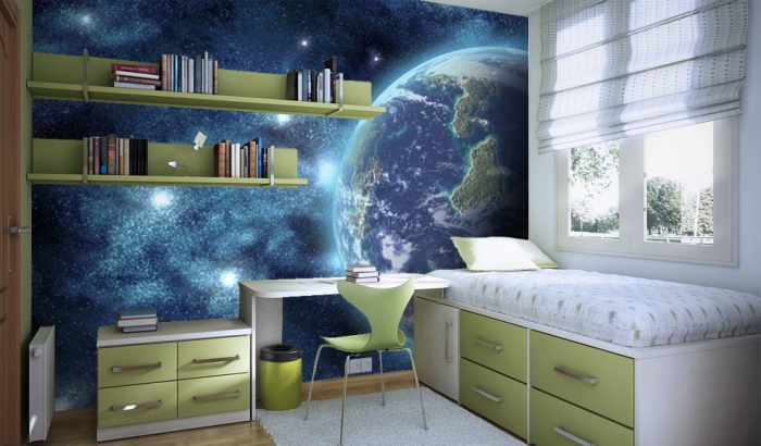 Детям старше 12 лет могут понравиться обои, оформленные в духе путешествий: корабли или достопримечательности, городские пейзажи или самолеты. Интересны небесная (звезды, облака) и природная (деревья, животные) темы.