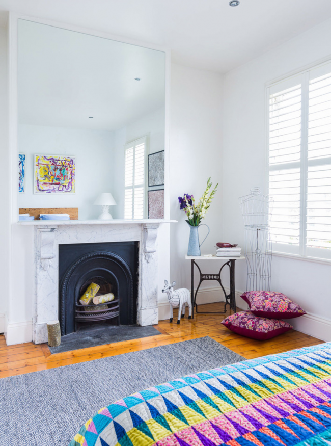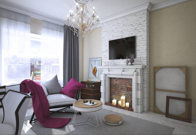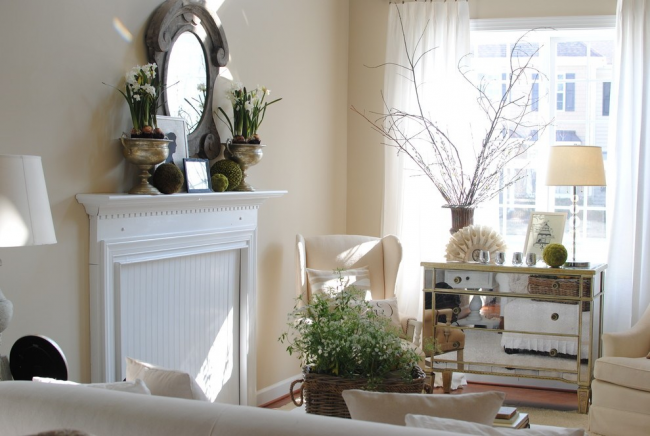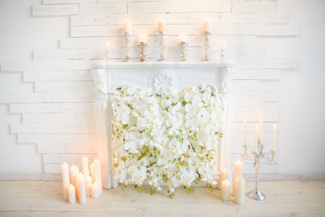 Белоснежная комната с зеркальным декоративным камином, отражающим свечи
