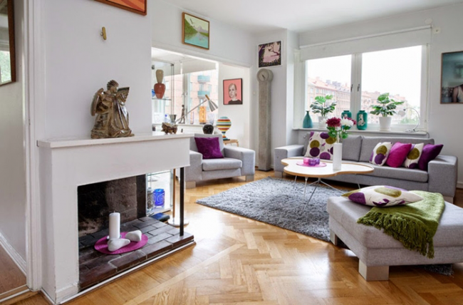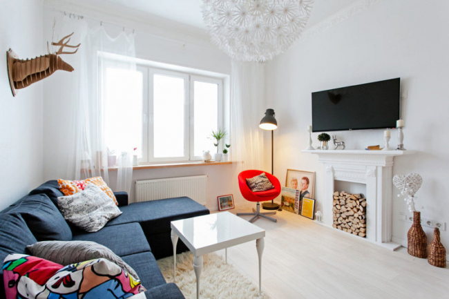 Эффектным решением станет приобретение передвижного фальш-камина, который вам помогут сделать в мебельной мастерской, что позволит вам не привязывать интерьерный рисунок к стационарному предмету декора, а использовать его в разных комнатах.