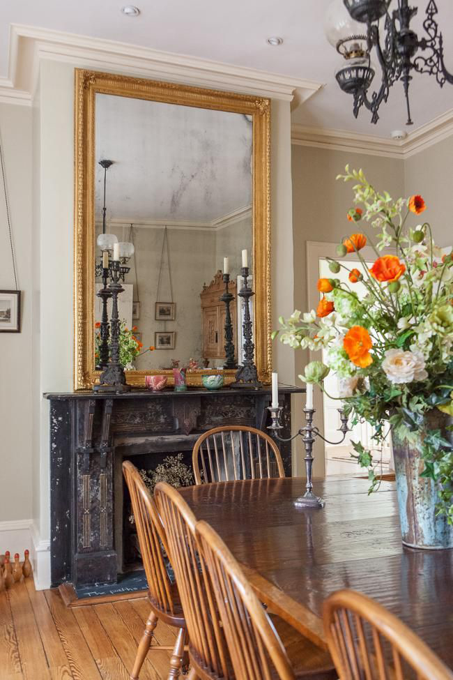 Сухоцветы и подсвечники отлично смотрятся в старинном камине с потертым фасадом