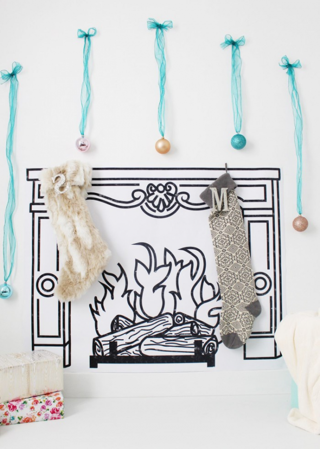 Нарисованный каминный очаг отлично заменит настоящий камин в новогодние праздники