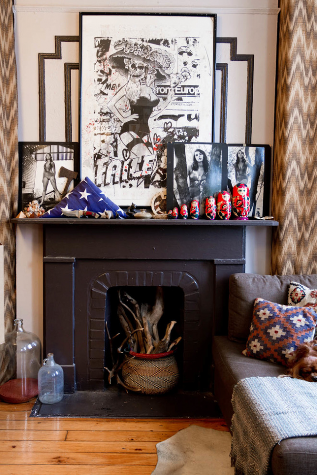 На полке камина собрана коллекция матрешек, фотографии и гротескные картины, а внутри топки – плетеная ваза с ветками