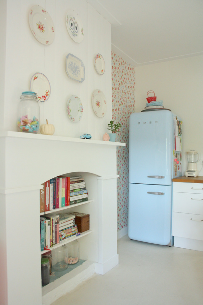 Декоративный камин в кухне можно использовать как стеллаж, хранить в нем книги с рецептами, разные баночки с сыпучими продуктами и другие мелочи