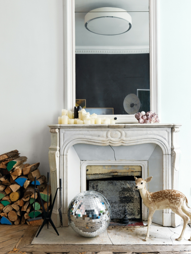 Можно обвить каминный портал электрической елочной гирляндой или мишурой – главное, не переборщить с украшениями.