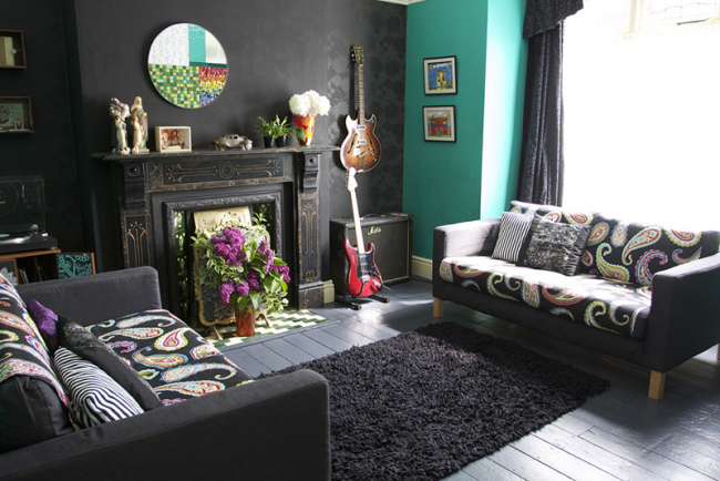 Гостиная в черно-золотом цвете с резным фальш-камином