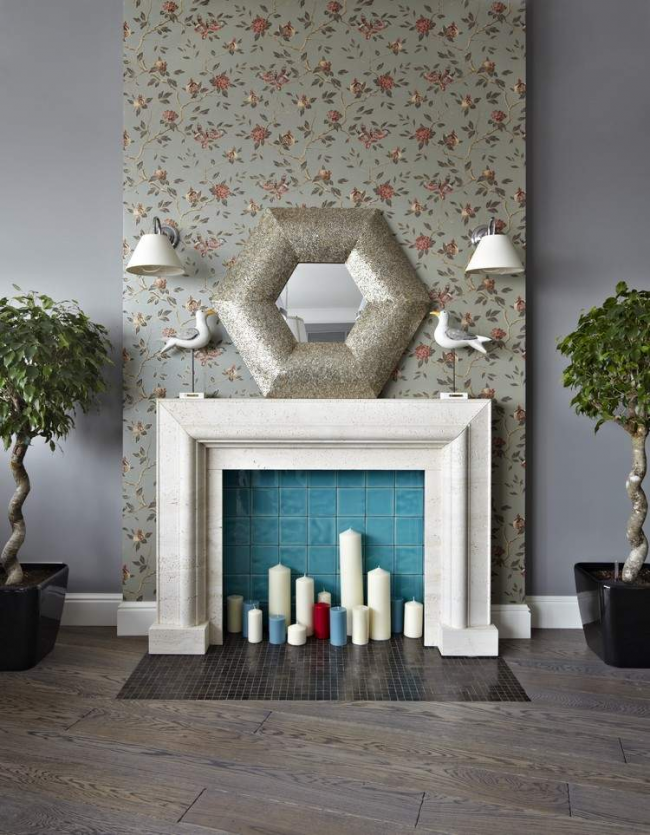 Туда можно поставить свечи, красивые инсталляции или даже сложить поленницу из тонких веток. Чтобы зрительно увеличить глубину такой имитации до “положенных” сорока сантиметров, можно выложить нишу зеркальным полотном или плиткой.