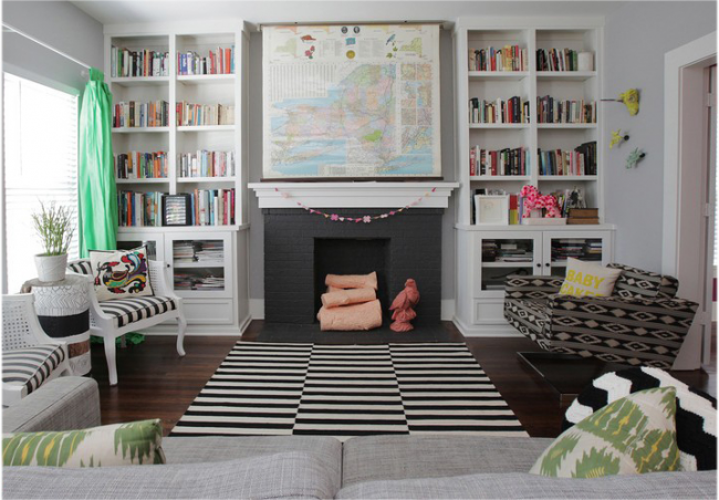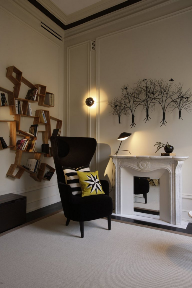 Книжная коллекция, размещенная не в шкафу, а в каминном проеме, смотрится оригинально