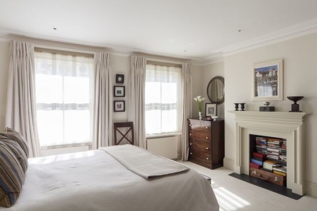 Для спальни органичны ампир или классика, выполненные в теплых тонах. Белые панели с причудливой лепниной вносят в интерьер мягкую нотку домашнего уюта, а декоративное обрамление фальш-камина деревом наполняет помещение изысканностью аристократизма. К тому же этот предмет может стать и своеобразным туалетным столиком, если над ним поместить зеркало.