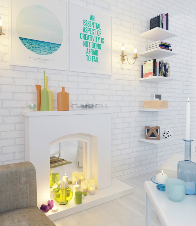 Для оформления такого фальш камина подойдет обычная грифельная доска. Лучше всего, если это будет обычный плоский фальш камин: в очаг вставляется грифельная или магнитная доска, сбоку можно приделать симпатичные полочки и разложить на них магнитики, цветные мелки или маркеры. Такой камин – это не просто декор, но еще и средство развлечения и развития для детей. Можно будет вместе играть в угадайку, складывать слова из магнитов и так далее. Если есть желание, обустройте такой фальш камин в детской, а рядом установите рабочий уголок ребенка.