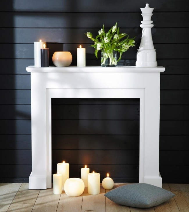 Несмотря на присутствие оригинальных решений, самым популярным остается фальш-камин со свечами. И профессиональные, и домашние дизайнеры выбирают для декорирования именно свечи. Их устанавливают и в топочное отверстие, и на каминную полку. Подбирают по размеру и цвету, выстраивают в различные комбинации, ставят просто на пол или размещают в многоярусных канделябрах.
