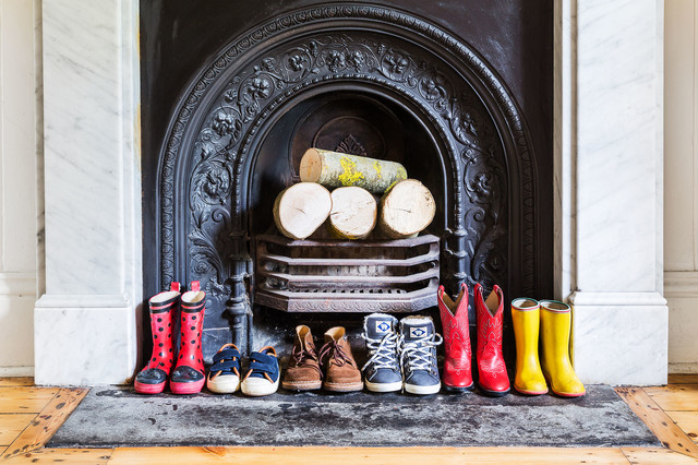 Каминная ниша в роли шкафа. В нее можно поместить обувные коробки