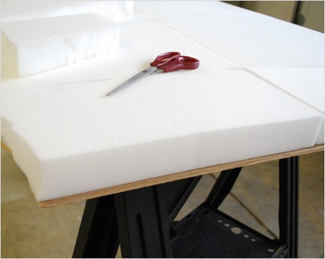 Берем фанерный лист, желательно по толще, и накладываем на него поролон в два слоя.