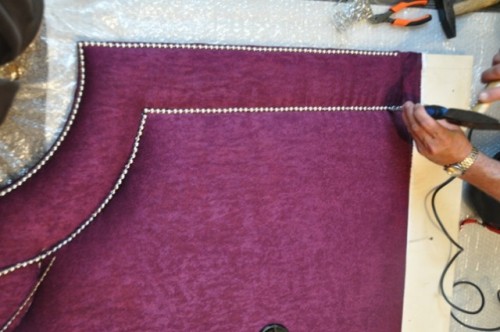 Мебельными гвоздиками украсьте обивку, закрепив их в 1 сантиметре от края изголовья кровати.