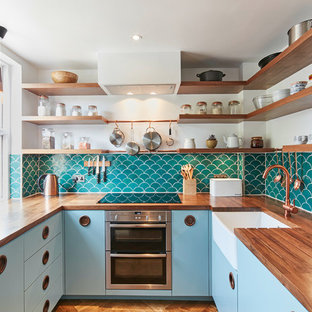 Идея дизайна: угловая кухня в стиле фьюжн с накладной раковиной, плоскими фасадами, черными фасадами, синим фартуком, бежевым полом и черной техникой
