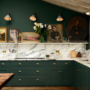 Неиссякаемый источник вдохновения для домашнего уюта: угловая кухня среднего размера в классическом стиле с фасадами в стиле шейкер, зелеными фасадами, разноцветным фартуком, двойной раковиной и паркетным полом среднего тона