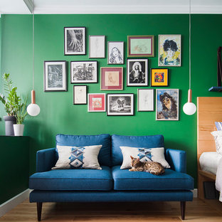 Стильный дизайн: спальня среднего размера в стиле фьюжн с зелеными стенами и ковровым покрытием – последний тренд
