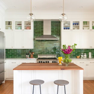 На фото: кухня в стиле фьюжн с плоскими фасадами, белыми фасадами, зеленым фартуком и фартуком из плитки кабанчик с
