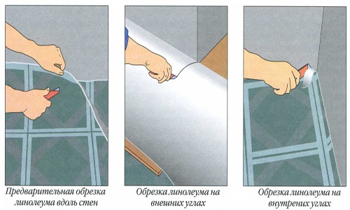 - Этот вид напольного покрытия довольно плотный и толстый, для того, чтобы разрезать его можно воспользоваться строительным ножом со съёмным лезвием. Главное, чтобы инструмент, которым будут производиться работы, был острым, в противном случае придётся прикладывать дополнительные усилия.