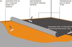 Если помещение жилое, то линолеум приклеивают. Перед этим на основание надо нанести грунтовку. После того, как она просохнет, зубчатым шпателем наносят на поверхность клей. На его впитывание нужно некоторое время, которое указано на упаковке.