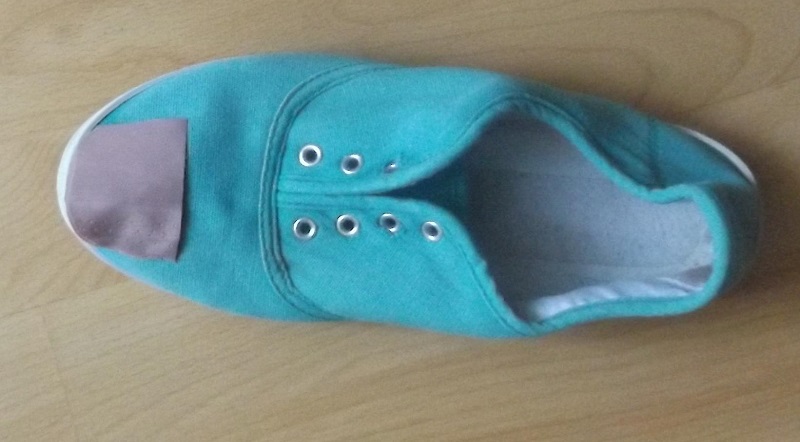 - Разрежь термозаплатку пополам. Убери защитную пленочку и приложи ткань к обуви.