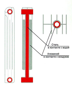 Биметаллические радиаторы с их уникальными свойствами лучше подходят для российских условий. Они сделаны из двух материалов: стали и алюминия. Труба, которая проходит внутри радиатора, сделана из стали, поэтому за прочность трубы при гидравлическом ударе беспокоиться не следует. Сталь имеет большую коррозионную стойкость, чем алюминий. Контакт алюминиевого корпуса и теплоносителя полностью исключен.