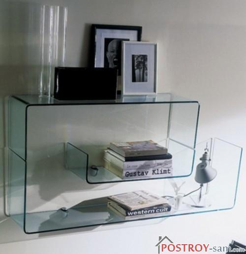 Данные полки являются интересным и практичным способом освещения, которые к тому же не теряют при этом своей функциональности. В сочетании с древесными или металлическими материалами, свет идет через стекло и отражается от всех ребер поверхности. Для увеличения данного эффекта можно применить специальное освещение снизу или сверху, смотря какого именно результата вы хотите достичь. При использовании такого освещения, создается какая-то таинственная и особенная атмосфера.