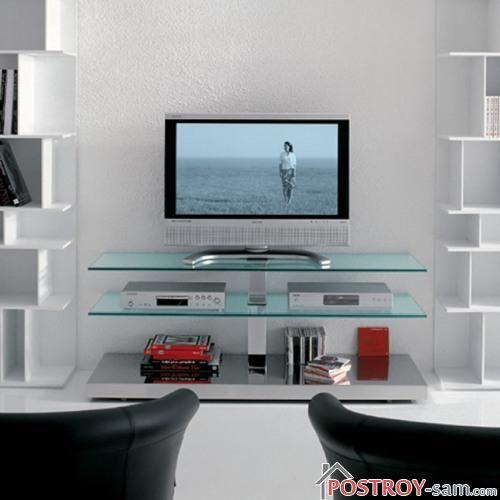 Стол со стеклянными полками под телевизор дополнит современный дизайн любого интерьера. К тому же, если они выполнены из качественного стекла, то и достаточно прочные. Выбор оригинальных стеклянных полок под телевизор очень широкий. Они могут быть прозрачными, черными, тонированными, матовыми. В зависимости от вашего желания допускается комбинирование стекла с различным материалом. Наиболее распространенные – дерево и металл.