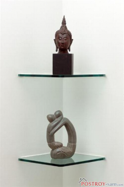 Угловые стеклянные полки довольно привлекательные и практичные, к тому же они очень устойчивые, а значит и долговечные. Такие полки просты в установке, поэтому вполне могут рассматриваться в качестве отдельного декоративного элемента. Лучше всего такие полки подойдут для ванной комнаты.