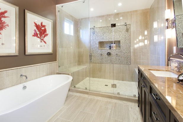 Отсек для душа с перегородкой может располагаться по всей площади чаши или занимать ее определенный участок, быть открытым или закрытым с потолком вверху. В ванной нередко реализуется функция джакузи с подачей воды, насыщенной воздушными пузырьками или нижнего гидромассажа для ступней.