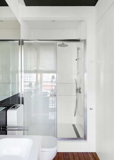 - Если сантехническая труба уходит в пол, необязательно приобретать поддон — часто над отверстием устанавливают сливной трап, делая к нему уклон и покрывая пол антискользящей плиткой, а на стенах закрепляют металлопрофиль и монтируют душевое ограждение. Такая конструкция более удобна для постоянного пользования, чем периодическое переступание через борт поддона.