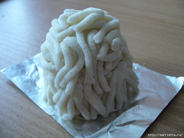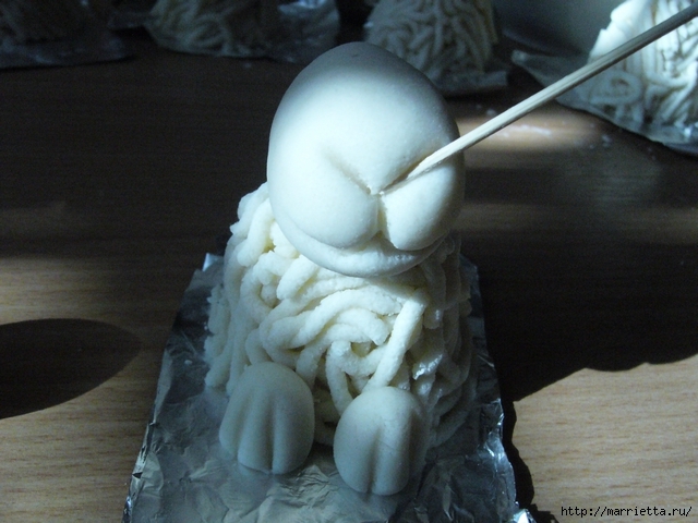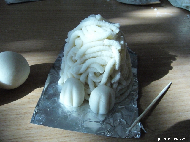 - на каркас налепить тесто, равномерно и аккуратно — это будет шубка;