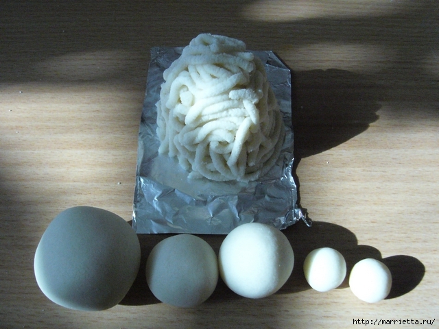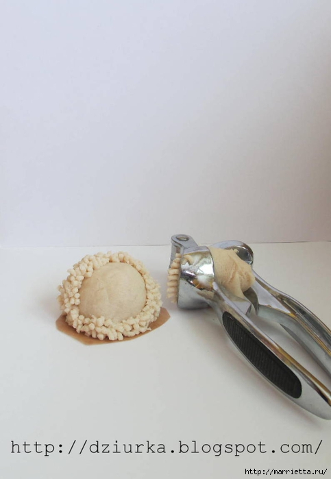 Лепку начинаем с раскатывания шарика. Можно серединку шарика сделать из фольги, экономия теста, да и фигурка будет легче по весу. Раскатав шарик, берем обычную чесночницу: