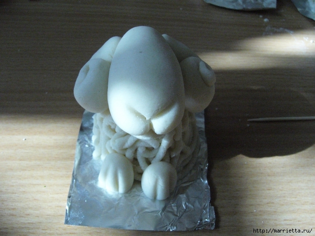 Лепешкой из соленого теста оборачиваем каркас, формируя туловище ягненка. Лепим ушки и приклеиваем к мордочке при помощи кисточки, смоченной в воде.
