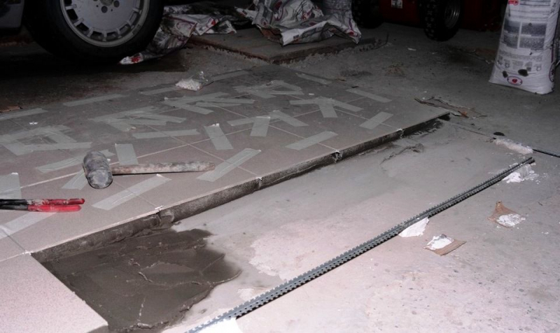 Чтобы уложить плитку, используют специальный клей. Его нужно наносить с зубчатого шпателя. При этом тщательно следите, чтобы клеевой состав не попадал на внешнюю часть. Постоянно контролируйте процесс с уровнем в руках. Между соседними элементами надо вставлять крестики, выполненные из пластика. А когда пройдет три дня, можно будет уже затереть все швы. Потом останется только хорошо очистить пол из керамической плитки. Примерно через 2 недели машину уже можно отправлять в гараж.