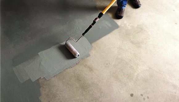 - Покрасить. Краску следует использовать для сухих и чистых оснований, если температура в гараже не ниже нуля градусов. Для этого бетонную стяжку предварительно обрабатывают грунтовкой. Используют минеральные краски или на основе акриловой смолы. Работать лучше валиком или кистью. Можно использовать и распылитель. Наносят краску в несколько слоев, дожидаясь полного высыхания предыдущего слоя. Бетонный пол в гараже будет готов к эксплуатации через 3–5 дней. Покрасить основание – это бюджетный вид отделки.
