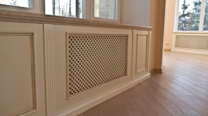 Чтобы громоздкие радиаторы, исчезая с глаз долой, не забрали с собой и тепло нужно придерживаться следующих правил. Не стоит прятать систему отопления в глубокие ниши. Чем глубже, тем холоднее. Глухие экраны – тоже не лучшее решение. Из какого бы теплопроводящего материала они не были сделаны, без циркуляции воздуха комфортной температуры в помещении не добиться, да и тепловое излучение дальше такого щита не пройдет. Для сохранения теплоотдачи на приемлемом уровне для защиты батарей следует выбирать панели, предусматривающие крупнозернистые решетки сверху и по бокам.